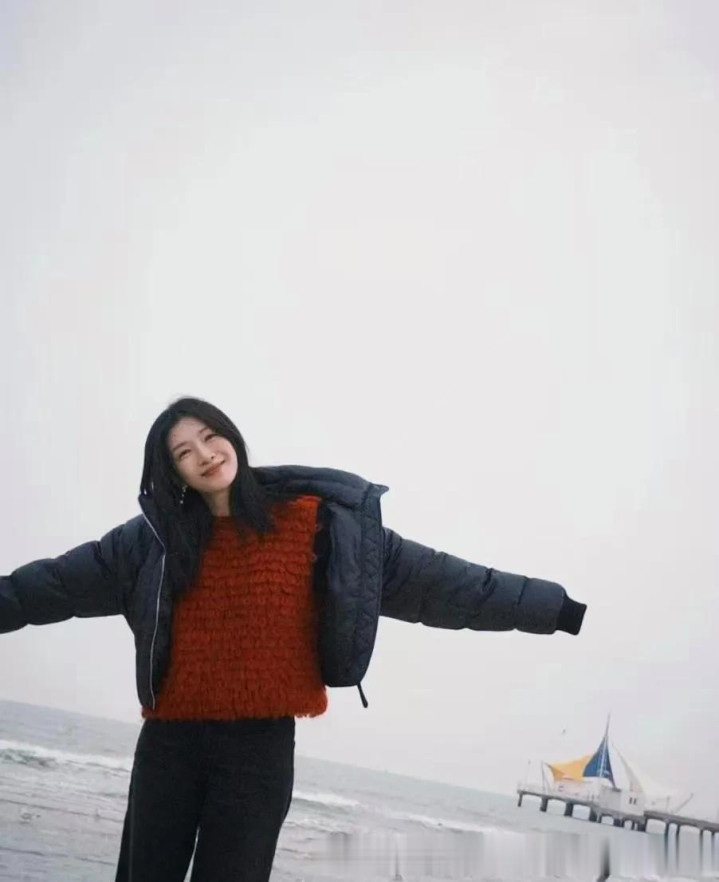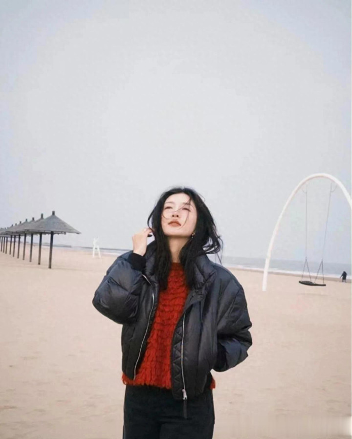江疏影的穿搭才叫有品位! 黑色羽绒服+红色马甲+阔腿裤 时髦又高级