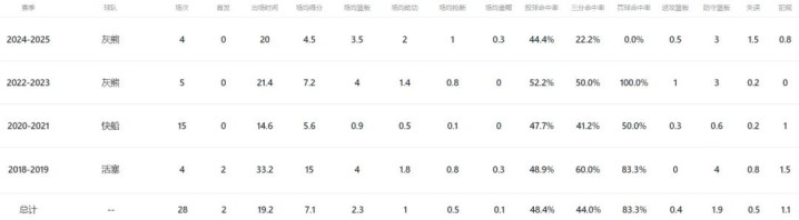 过往数据显示,到了刺刀见红的季后赛,肯纳德依然能够保持超高的投射效率,迄今为止分别为活塞、快船和灰熊打过季后赛,场均上阵19.3分钟得到7.1分2.3板1助,场均以44%命中率扔进1.4记三分球,美中不足的是产量不太高。