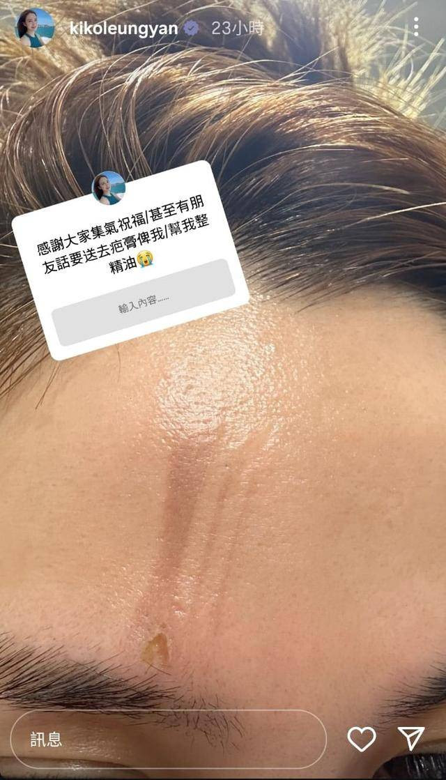 早前梁茵遭遇严重意外,被一支高温达150度的电发棒砸中脸部,导致她右眉上方皮肤,明显有烧焦痕迹,表皮脱落伤口触目惊心。