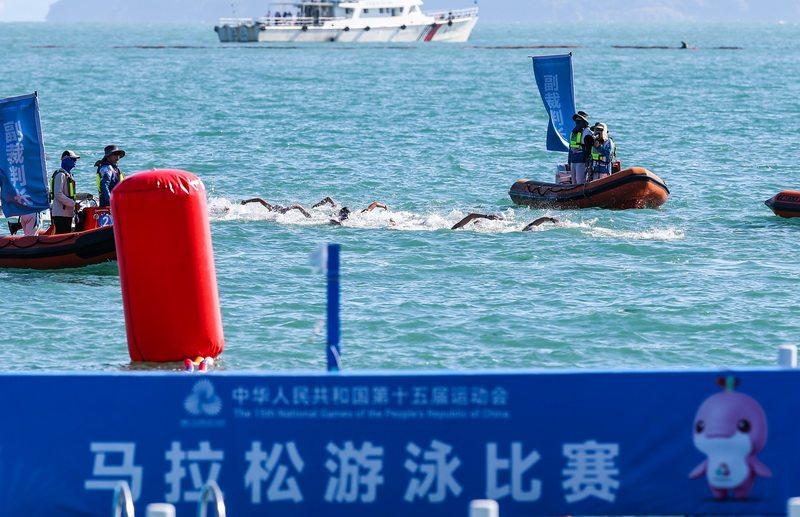 11月5日,参赛选手们在第十五届全运会马拉松游泳比赛中。