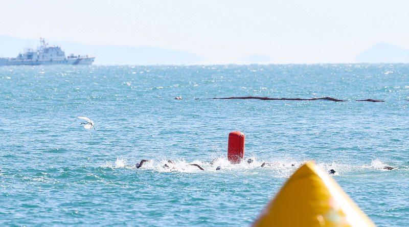 11月5日,一只白鹭与马拉松游泳选手们“同场竞技”。