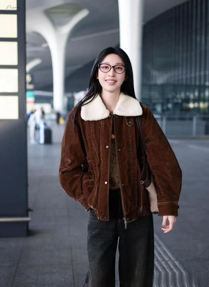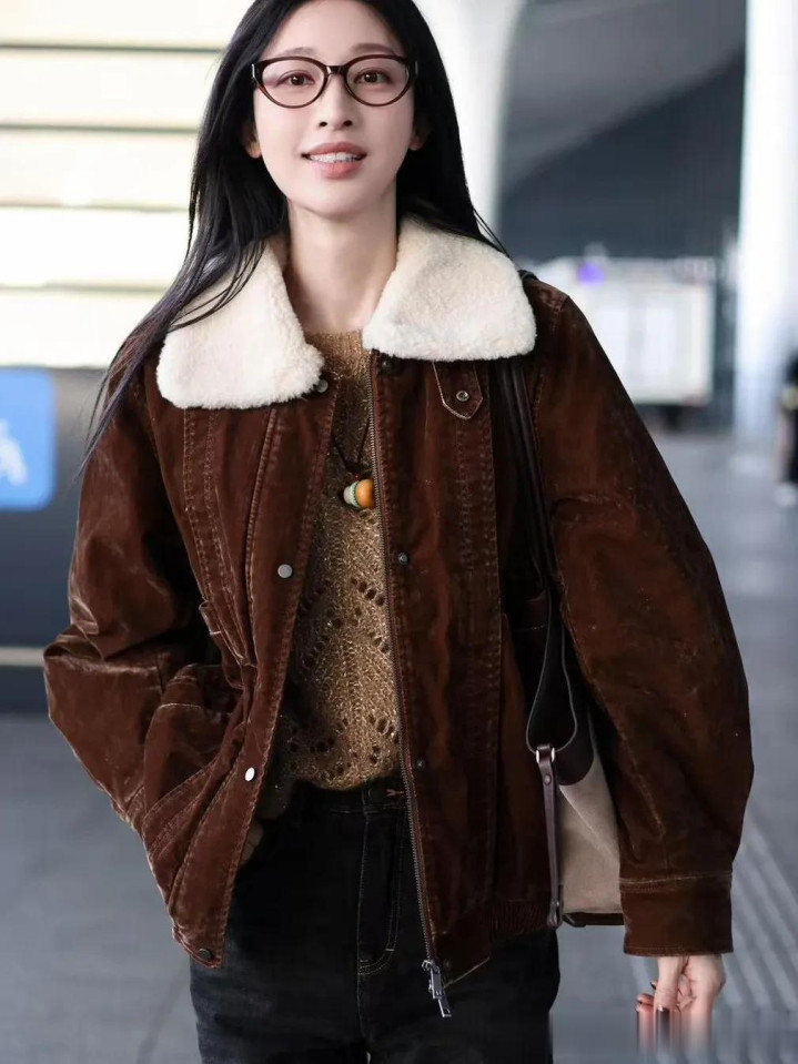 张俪会穿是数一数二的! 棕色毛领夹克+阔腿裤, 时髦洋气又高级