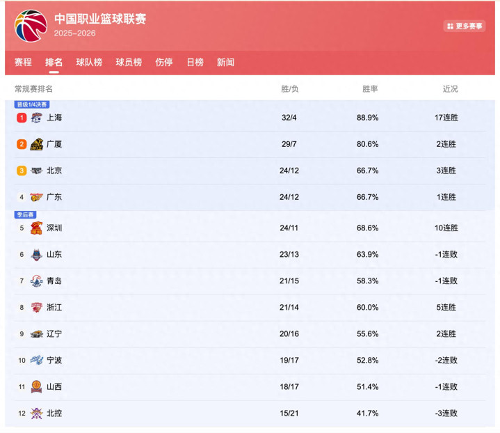 目前CBA最新比赛日已经结束,包括广东、北京等各大球队的排名也再度发生了变化,和各位球迷来详细了解一下。