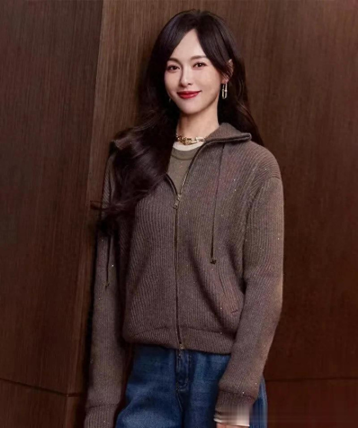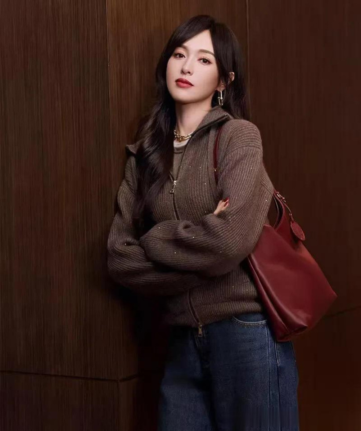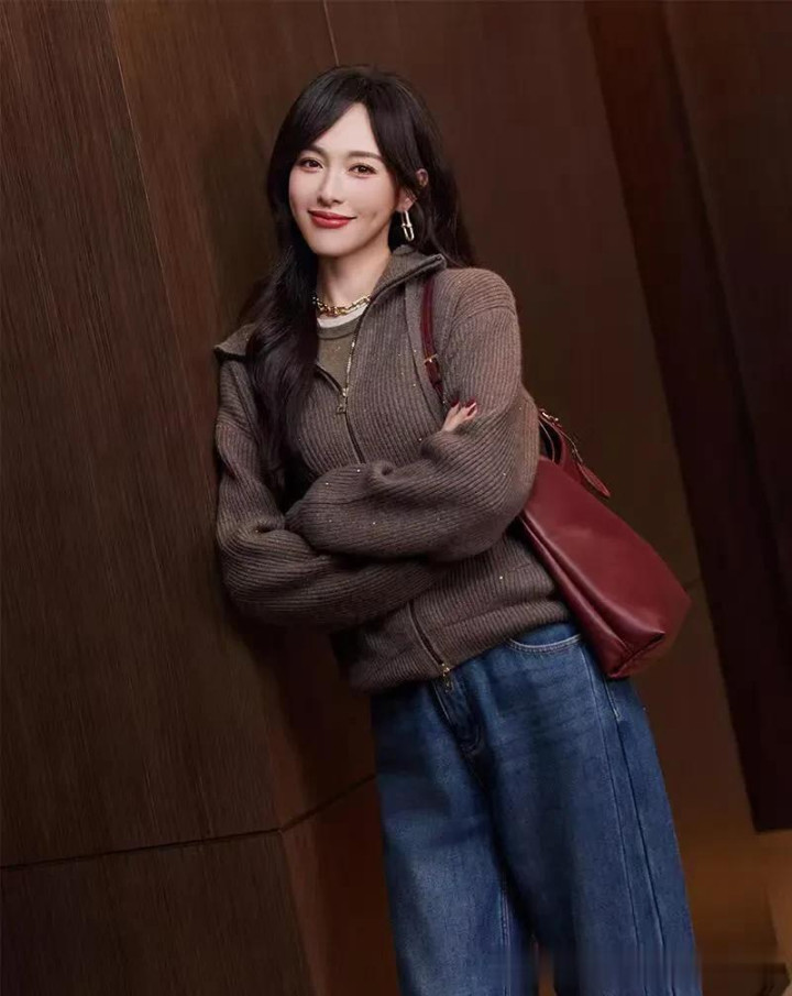 唐嫣当妈后气质越发高级! 穿焦糖棕连帽开衫+牛仔裤, 时髦又洋气
