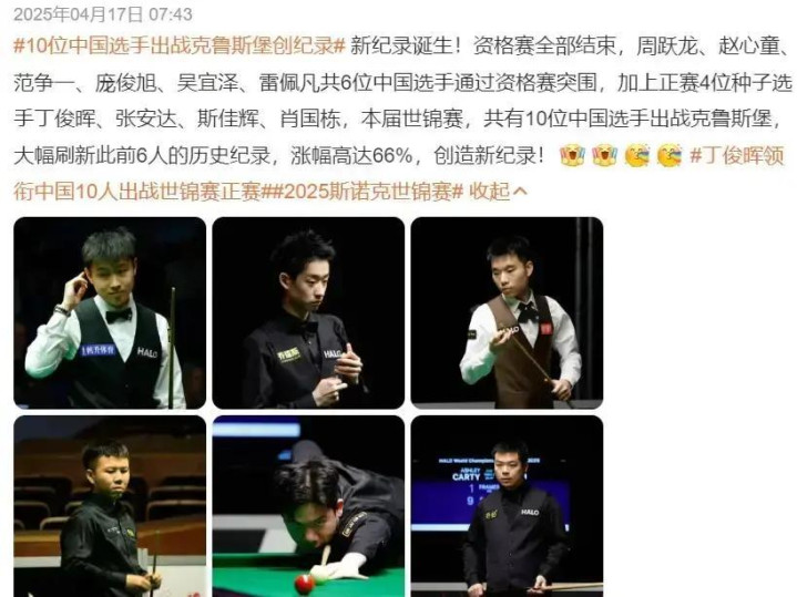 还有好多中国选手在打资格赛,前后加起来有二十多个人,要是能多几个从资格赛打出来,正赛的中国选手数量就能破之前的纪录了。