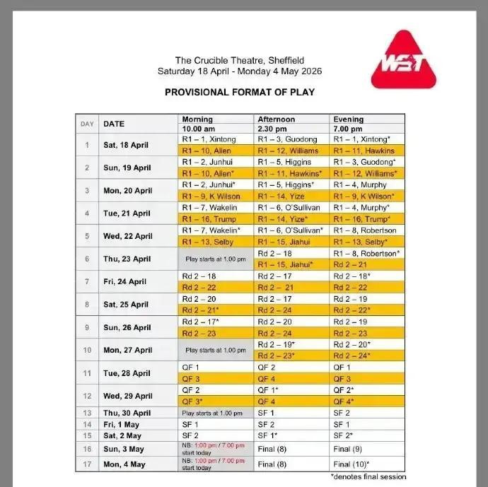 现在资格赛还在打,正赛的时间和各个种子的出场时段都已经出来了,分好几个时段,从下午到凌晨都有,要看的话得记好时间别错过。
