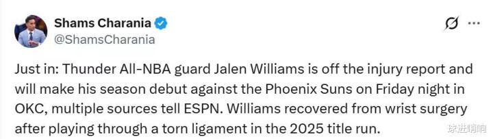 根据ESPN名记Shams报道,因手腕伤势赛季缺席至今的杰伦威廉姆斯已从伤病名单中被移除,确定将在雷霆对阵太阳的比赛中迎来首秀。