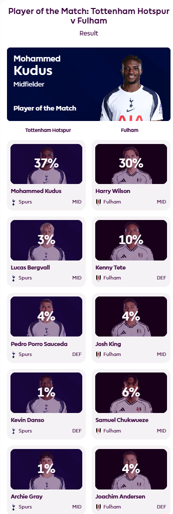 赛后,库杜斯在英超官方的球迷票选本场最佳环节获得了37%的选票,当选全场最佳球员。