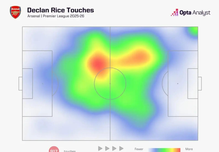 赖斯同样在攻防两端展现全能身手。他不仅擅长夺回球权,更频频插入禁区创造杀机。本赛季他在各项赛事已直接参与7粒进球(进球+助攻),队内仅次于特罗萨德。数据印证这位英格兰中场的全面性:拦截凶悍、出球从容、前插威胁凌厉。