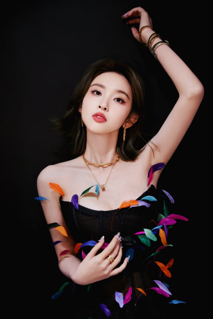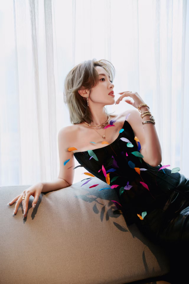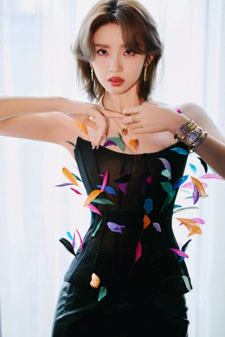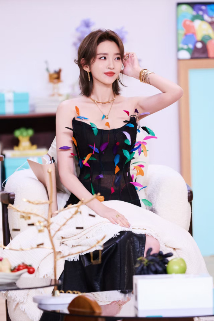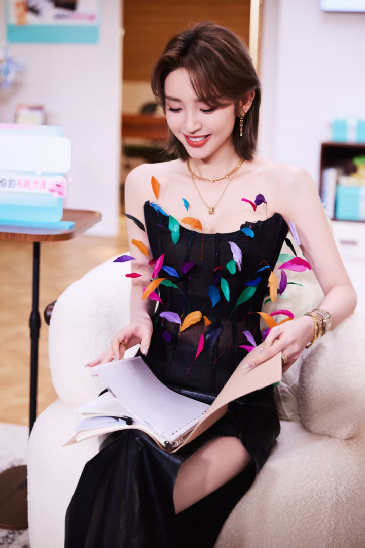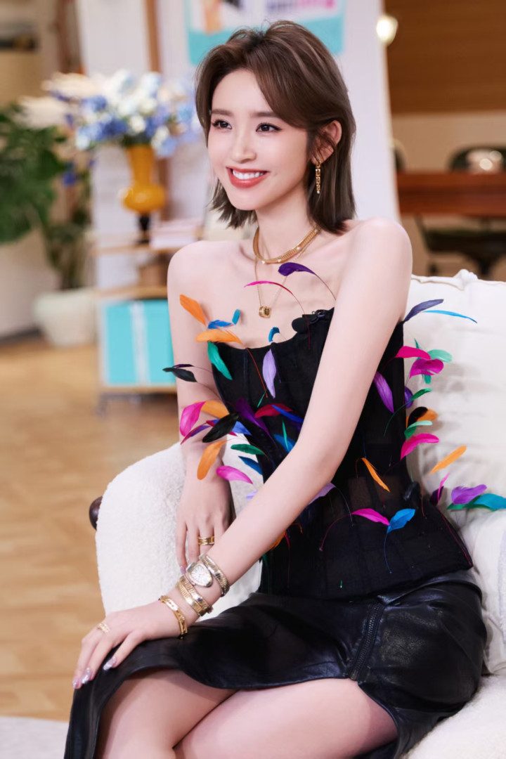 这件羽毛抹胸堪称“身材放大镜”,渐变粉紫的细碎羽毛顺着肩线层层叠叠,不是夸张的浓密款,而是轻盈得像自带柔光滤镜,既巧妙遮住了手臂拜拜肉,又让肩背线条显得薄而舒展。