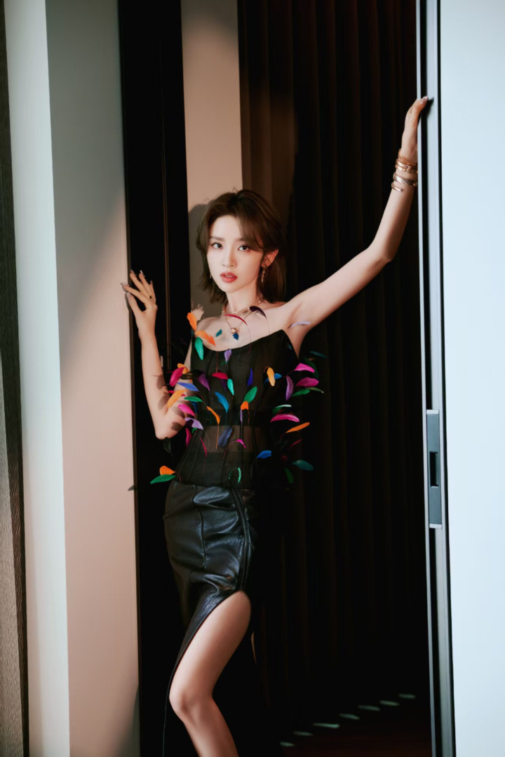 下装的黑色开叉皮裙则是“酷感担当”,哑光皮质自带高级雾面质感,没有繁杂的装饰,全靠利落剪裁赢了气场——高腰线直接拉到胸下三指,瞬间把下半身比例拉长,前侧的斜开叉设计更是点睛之笔,开叉高度刚好到大腿中上部,既不会过于暴露,又能在走路时不经意露出笔直纤细的腿部线条,搭配银色细带高跟鞋,腿长直接实现视觉翻倍。