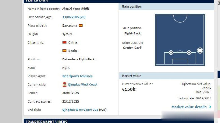 目前,杨希德转身价为15万欧,预估也会涨到25万欧左右。