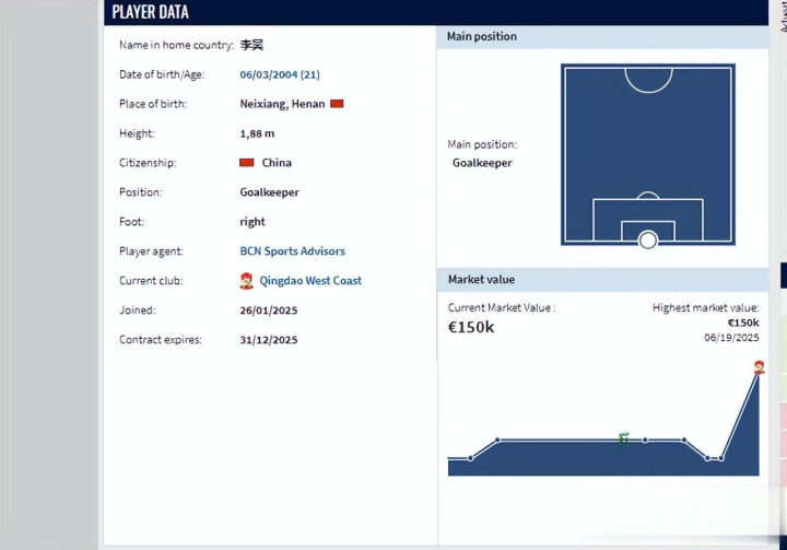 目前,李昊德转身价为15万欧,预估会涨到25万欧左右。